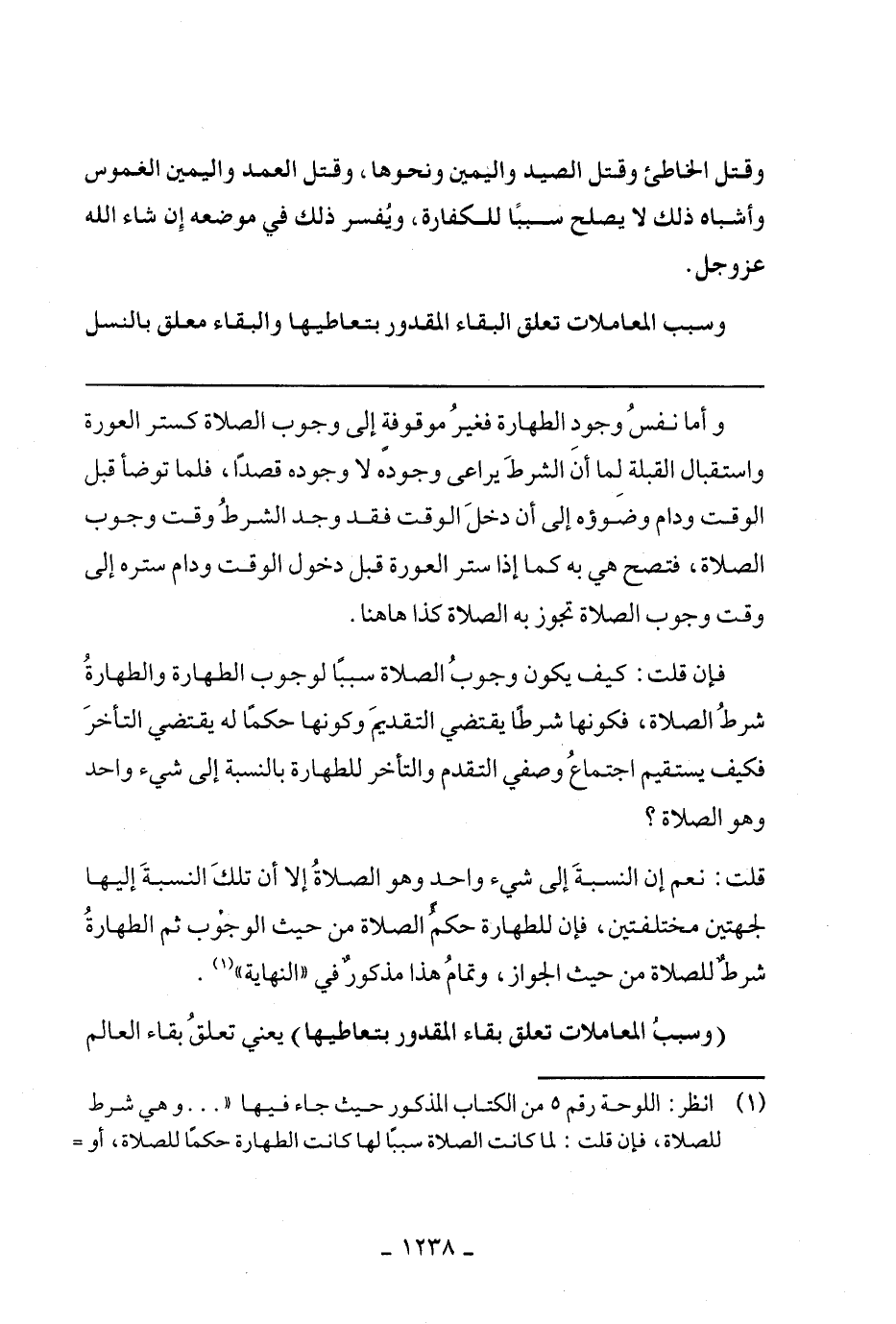 قلت: نعم إن النسبة إلى شيء واحد وهو الصلاة إلا أن تلك النسبة إليها لجهتين مختلفتين، فإن للطهارة كم الصلاة من حيث الوجوب ثم الطهارة شرط للصلاة من حيث الجواز، وتمام هذا مذكور في ((النهاية)).