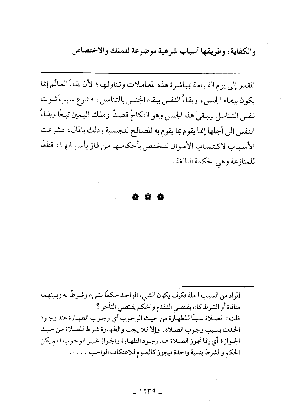 المقدر إلى يوم القيامة بمباشرة هذه المعاملات وتناولها؛ لأن بقاء العالم إنما يكون ببقاء الجنس، وبقاء النفس ببقاء الجنس بالتناسل، فشرع سبب ثبوت نفي التناسل ليبقى هذا الجنس وهو النكاح قصدًا وملك اليمين تبعًا وبقاء النفس إلى أجلها إنما يقوم به المصالح للجنسية وذلك بالمال، فشرعت الأسباب لاكتساب الأموال لتختص بأحكامها من فاز بأسبابها، قطعًا للمنازعة وهي الحكمة البالغة.