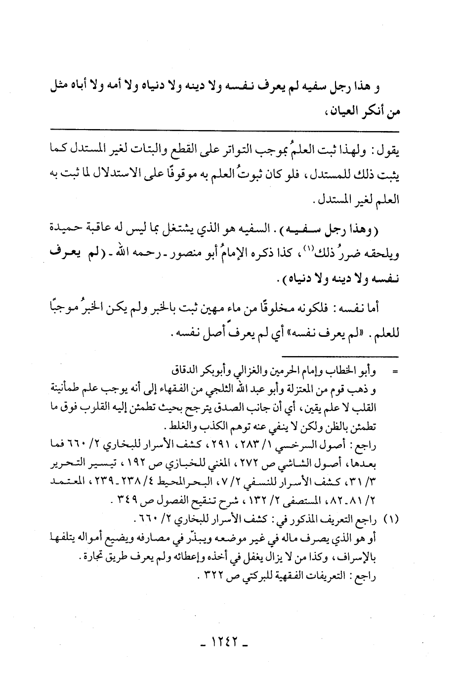 (وهذا رجل سفيه). السفيه هو الذي يشتغل بما ليس له عاقبة حميدة ويلحقه ضرر ذلك، كذا ذكره الإمام أبو منصور- رحمه الله- (لم يعرف نفسه ولا دينه ولا دنياه).