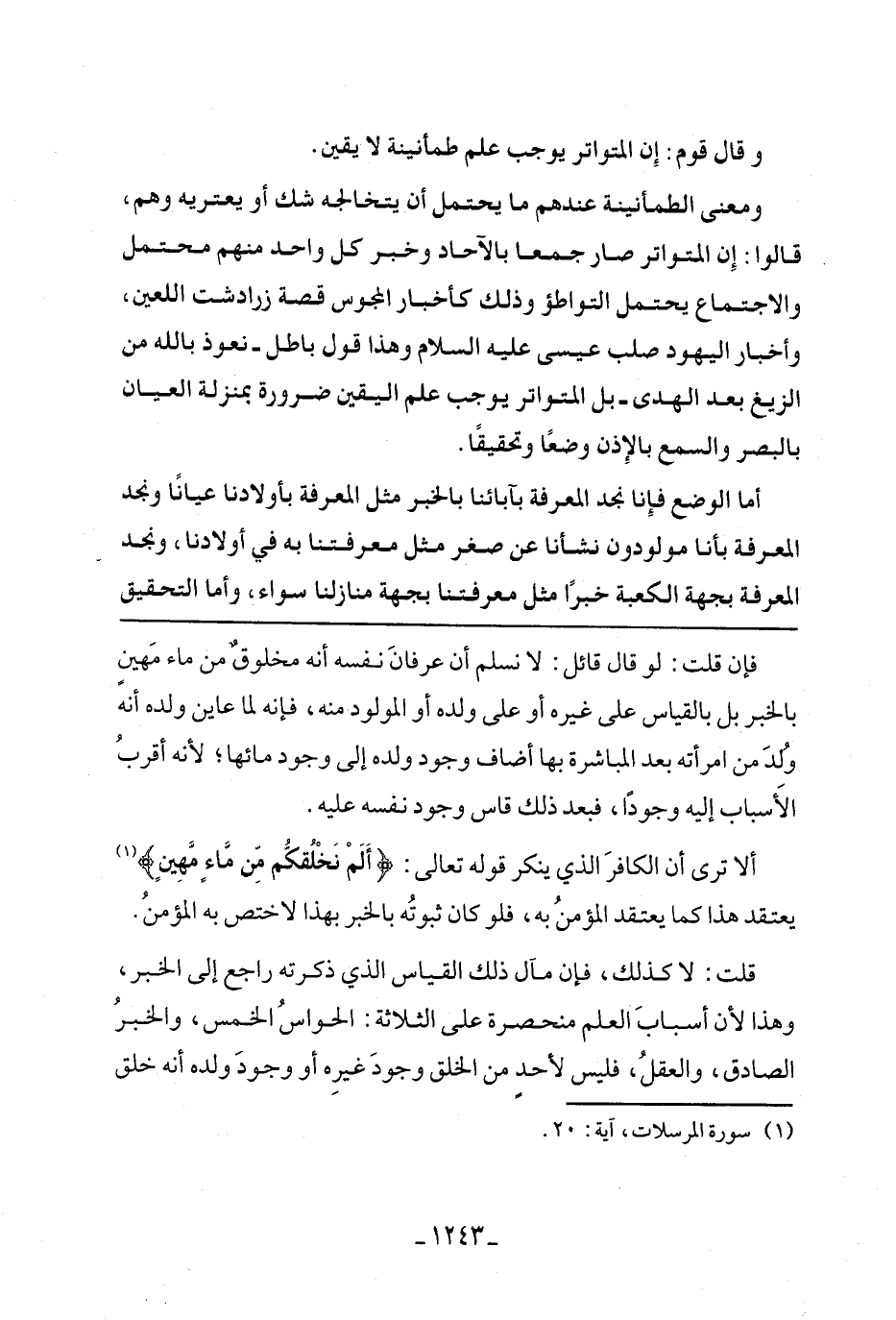ألا ترى أن الكافر الذي ينكر قوله تعالى: {أَلَمْ نَخْلُقْكُمْ مِنْ مَاءٍ مَهِينٍ} يعتقد هذا كما يعتقد المؤمن به، فلو كان ثبوته بالخبر بهذا لاختص به المؤمن.