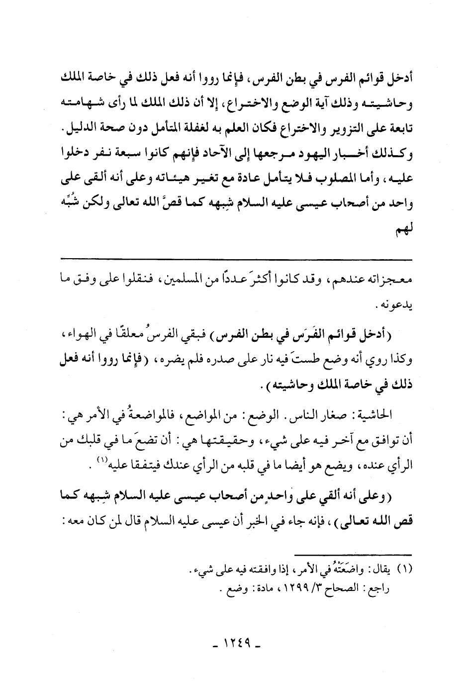 (أدخل قوائم الفرس في بطن الفرس) فبقى الرس معلقًا في الهواء، وكذا روي أنه وضع طست فيه نار على صدره فلم يضره، (فإنما رووا أنه فعل ذلك في خاصة الملك وحاشيته).