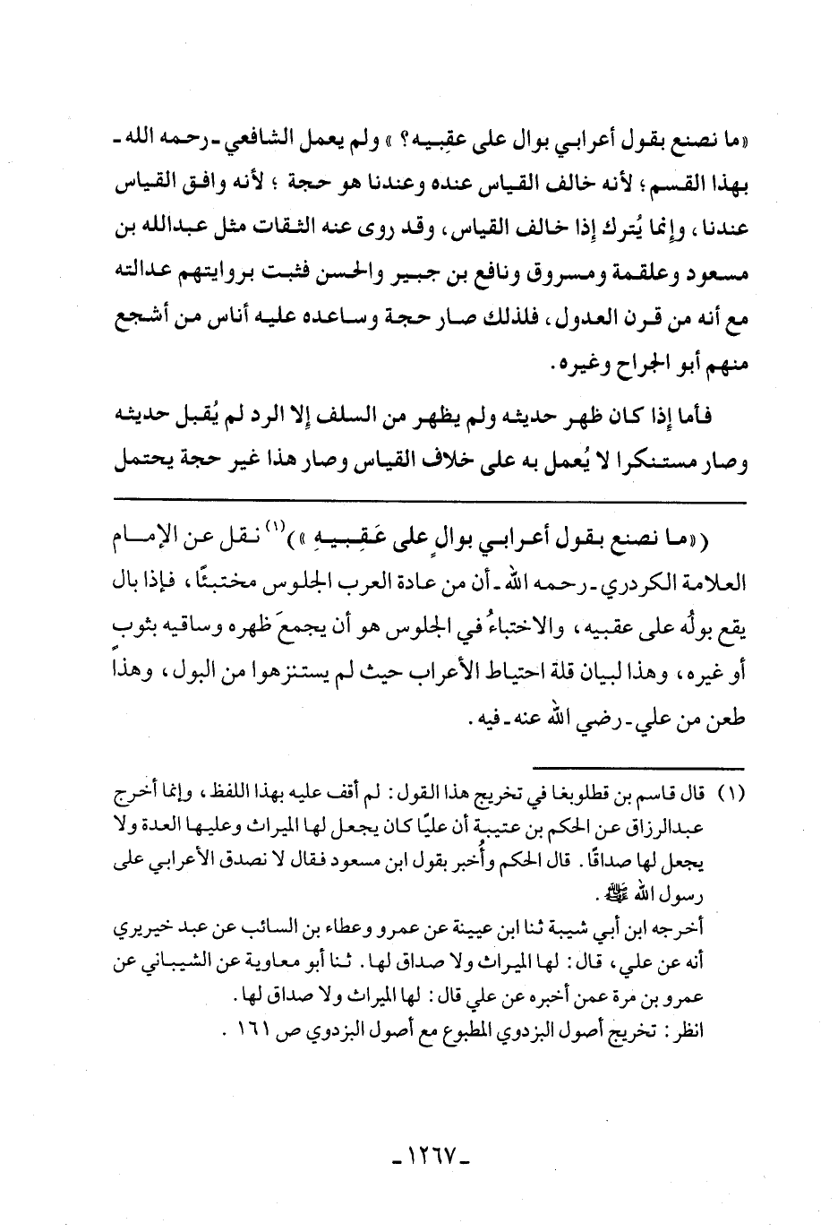 (((ما نصنع بقول أعرابي بوال على عقبيه))) نقل عن الإمام العلامة الكردري- رحمه الله- أن من عادة العرب الجلوس مختبئًا، فإذا بال يقع بوله على عقبيه، والاختباء في الجلوس هو أن يجمع ظهره وساقيه بثوب أو غيره، وهذا لبيان قلة احتياط الأعراب حيث لم يستنزهوا من البول، وهذا طعن من علي- رضي الله عنه- فيه.