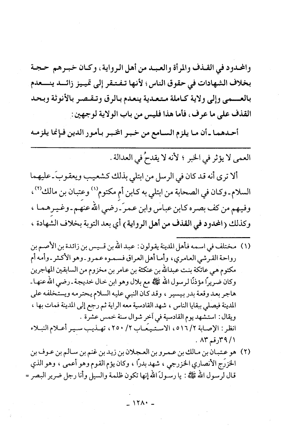 ألا ترى أنه قد كان في الرسل من ابتلى بذلك كشعيب ويعقوب- عليهما السلام- وكان في الصحابة من ابتلى به كابن أم مكتوم وعتبان بن مالك، وفيهم من كف بصره كابن عباس وابن عمر- رضي الله عنهم- وغيرهما، وكذلك (المحدود في القذف من أهل الرواية) أي بعد التوبة بخلاف الشهادة،