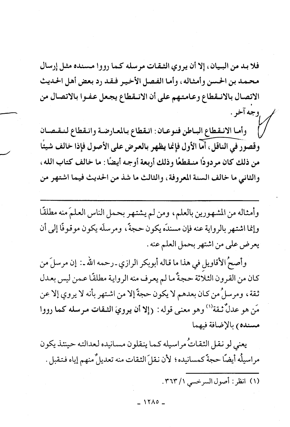وأصح الأقاويل في هذا ما قاله أبو بكر الرازي- رحمه الله-: إن مرسل من كان من القرون الثلاثة حجة ما لم يعرف منه الراية مطلقًا عمن ليس بعدل ثقة، ومرسل من كان بعدهم لا يكن حجة إلا من اشتهر بأنه لا يروي إلى عن من هو عدل ثقة وهو معنى قوله: (إلا أن يروي الثقات مرسله كما رووا مسنده) بالإضافة فيهما