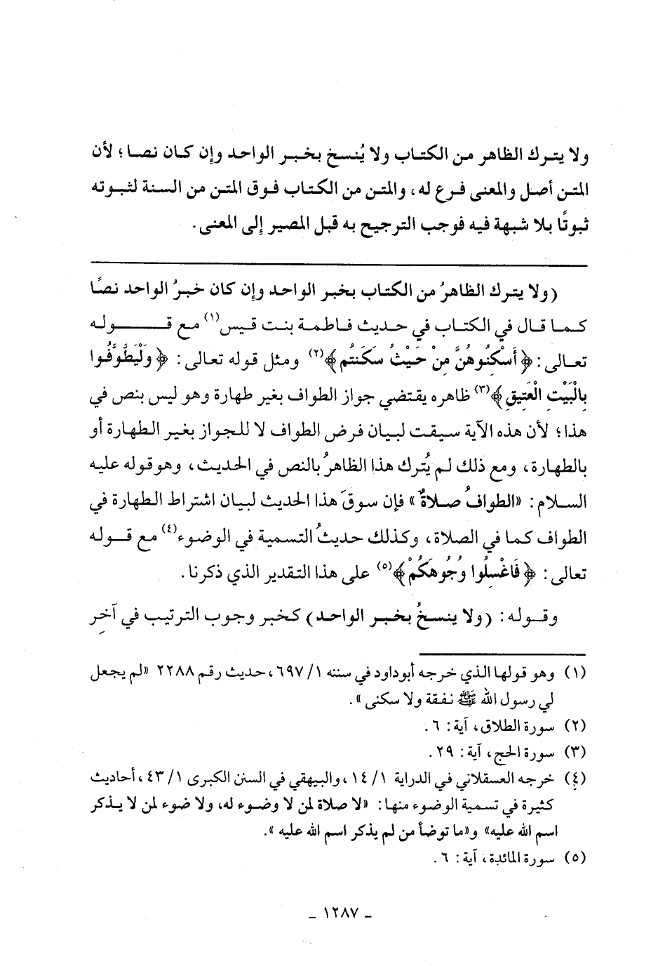 (ولا يترك الظاهر من الكتاب بخبر الواحد وإن كان خبر الواحد نصًا كما قال في الكتاب في حديث فاطمة بنت قيس مع قوله تعالى: {أَسْكِنُوهُنَّ مِنْ حَيْثُ سَكَنتُمْ} ومثل قوله تعالى: {وَلْيَطَّوَّفُوا بِالْبَيْتِ الْعَتِيقِ} ظاهرة يقتضي جواز الطواف بغير طهارة وهو ليس بنص في هذا؛ لأن هذه الآية سيقت لبيان فرض الطواف لا للجواز بغير الطهارة أو بالطهارة، ومع ذلك لم يترك هذا الظاهر بالنص في الحديث، وهو قوله عليه السلام: ((الطواف صلاة)) فإن سوق هذا الحديث لبيان اشتراط الطهارة في الطواف كما في الصلاة، وكذلك حديث التسمية في الوضوء مع قوله تعالى: {فَاغْسِلُوا وُجُوهَكُمْ} على هذا التقدير الذي ذكرنا.