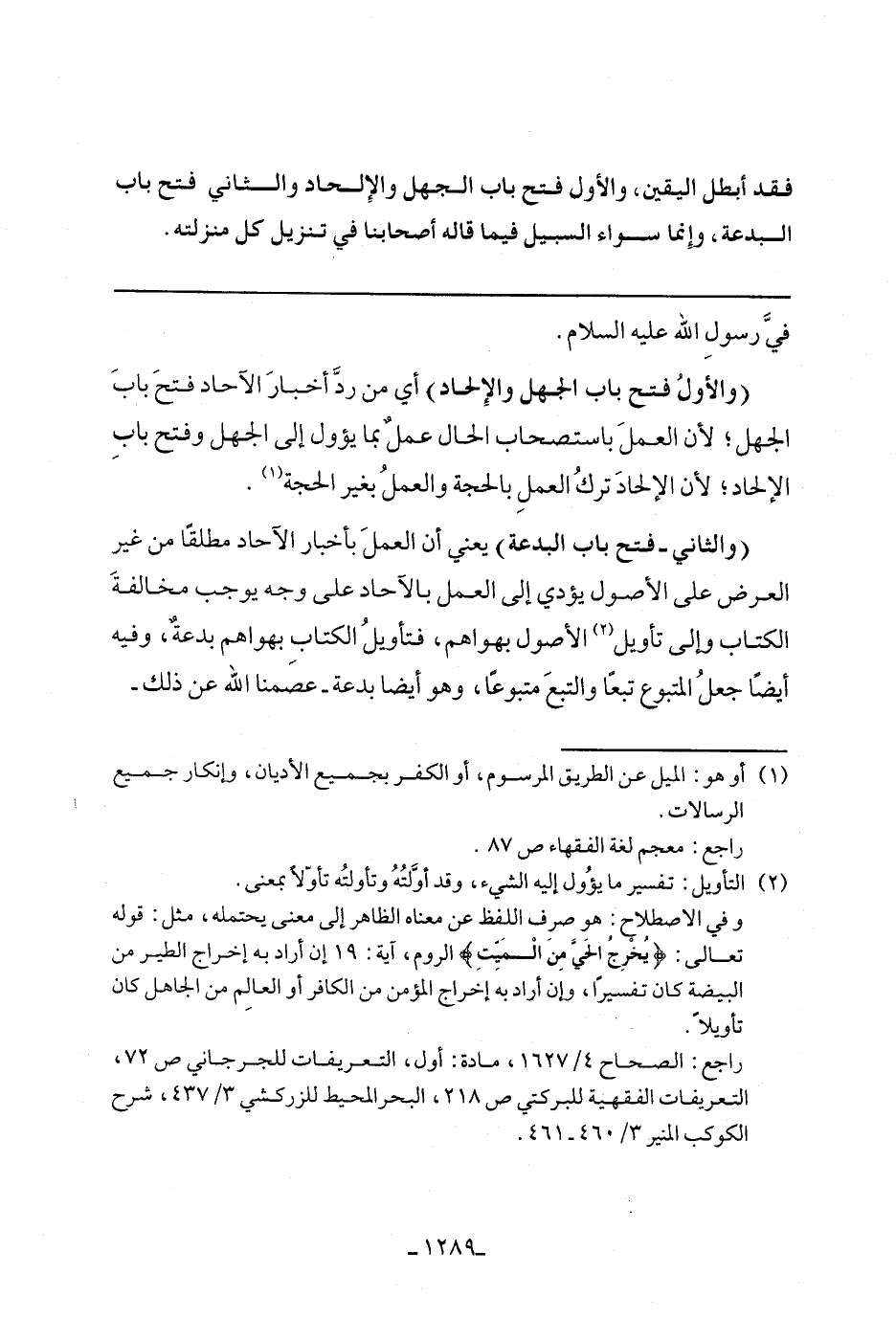 (والثاني- فتح باب البدعة) يعني أن العمل بأخبار الآحاد مطلقًا من غير العرض على الأصول يؤدي إلى العمل بالآحاد على وجه يوجب مخالفة الكتاب وإلى تأويل الأصول بهواهم، فتأويل الكتاب بهواهم بدعة، وفيه أيضًا جعل المتبوع تبعًا متبوعًا، وهو أيضًا بدعة- عصمنا الله عن ذلك-