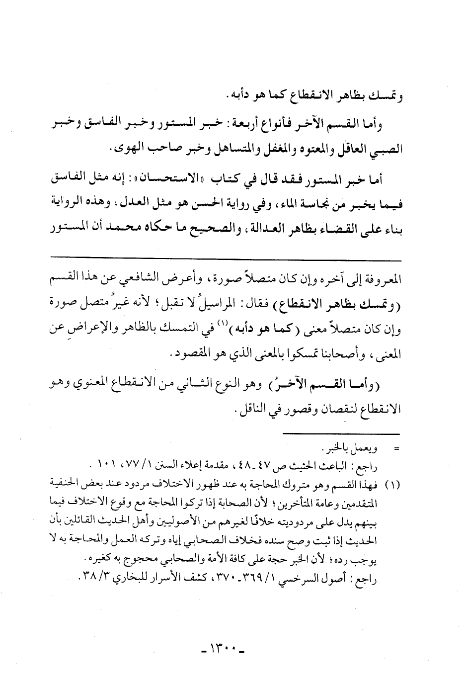 المعروفة إلى آخره وإن كان متصلًا صورة، وأعرض اشافعي عن هذا القسم (وتمسك بظاهر الانقطاع) فقال: المراسيل لا تقبل؛ لأنه غير متصل صورة وإن كان متصلًا معنى (كما هو دأبه) في التمسك بالظاهر والإعراض عن المعنى، وأصحابنا تمسكوا بالمعنى الذي هو المقصود.