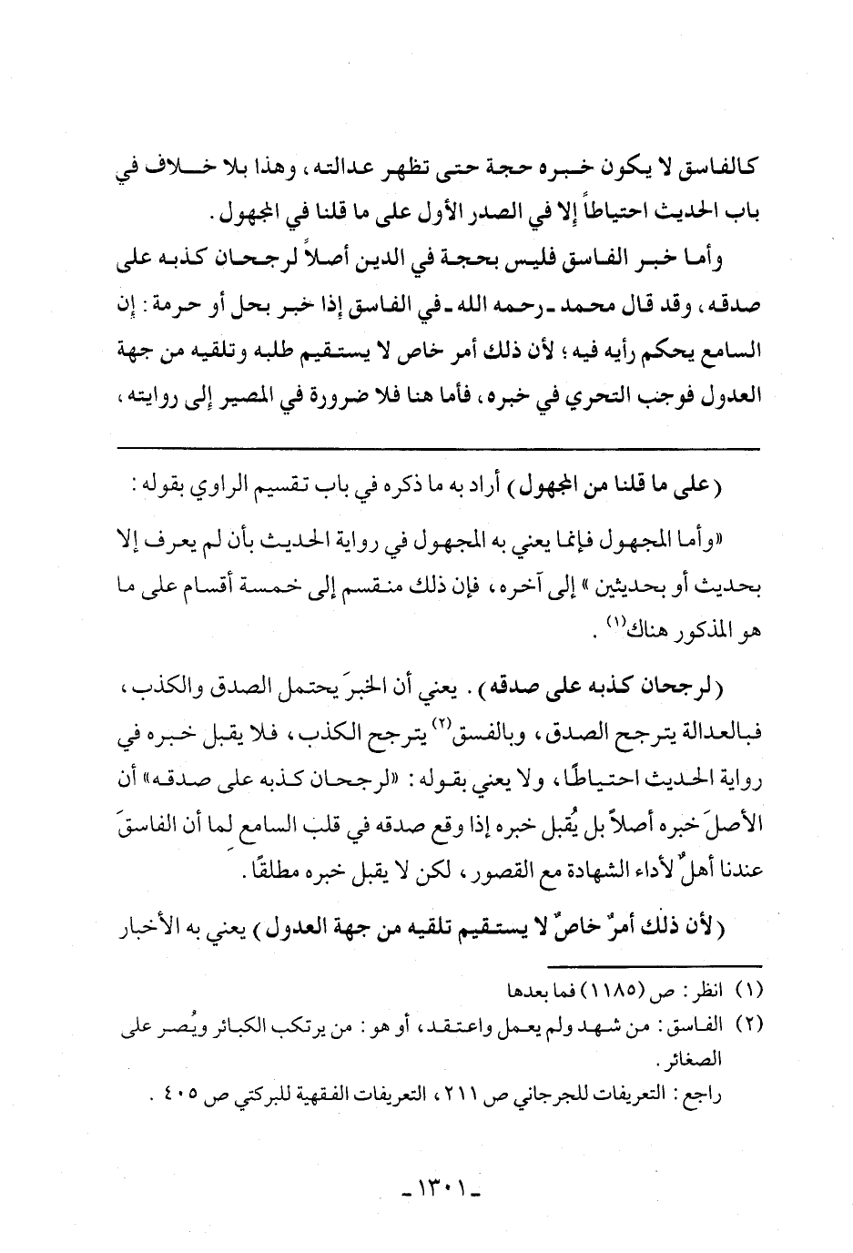 (لرجحان كذبه على صدقه). يعني أن الخبر يحتمل الصدق والكذب، فبالعدالة يترج الصدق، وبالفسق يترجح الكذب، فلا يقبل خبره في رواية الحديث احتياطًا، ولا يعني بقوله: ((لرجحان كذبه على صدقه)) أن الأصل خبره أصلًا بل يقبل خبره إذا وقع صدقه في قلب السامع لما أن الفاسق عندنا أهل لأداء الشهادة مع القصور، لكن لا يقبل خبره مطلقًا.