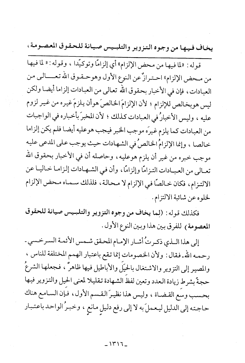 إلى هذا الذي ذكرت أشار الإمام المحقق شمس الأئمة السرخسي- رحمه الله- فقال: ولان الخصومات إنما تقع باعتبار الهمم المختلفة للناس، والمصير إلى التزوير والاشتغال بالحيل والأباطيل فيها ظاهر، فجعلها الشرع حجة بشرط زيادة العدد وتعيم لفظ الشهادة تقليلًا لمعنى الحيل والتزوير فيها بحسب وسع القضاة، وليس هذا نظير القسم الأول، فإن السامع هناك حاجته إلى الدليل ليعمل به لا إلى رفع دليل مانع، وخبر الواحد باعتبار