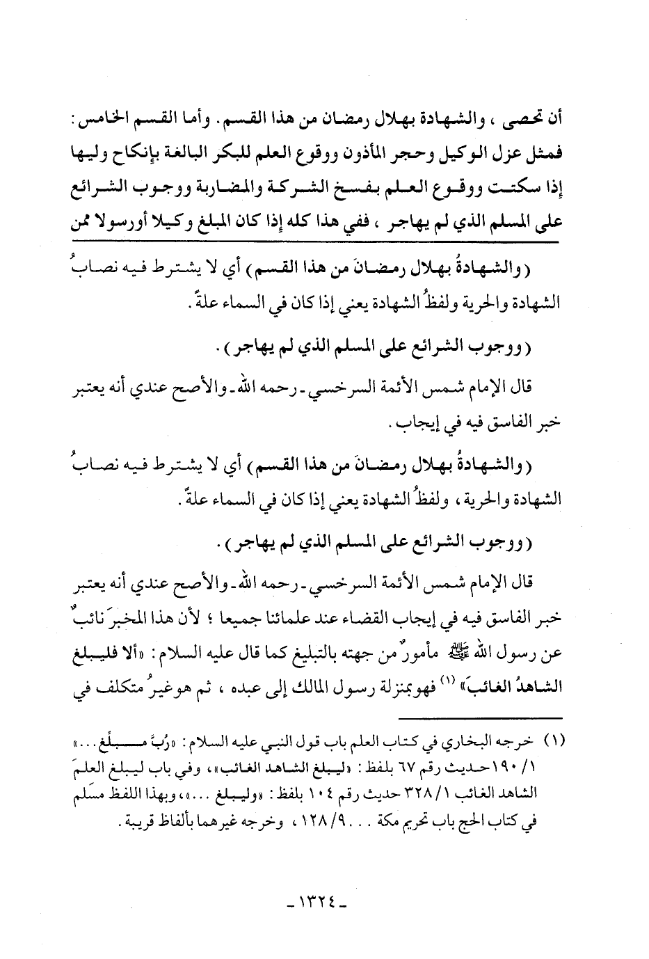 قال الإمام شمس الأئمة السرخسي- رحمه الله- والأصح عندي انه يعتبر خبر الفاسق فيه في إيجاب القضاء عند علمائنا جميعًا؛ لأن هذا المخبر نائب عن رسول الله - صلى الله عليه وسلم - مأمور من جهته بالتبليغ كما قال عليه السلام: ((ألا فليبلغ الشاهد الغائب)) فهو بمنزلة رسول الله إلى عبده، ثم هو غير متكلف في