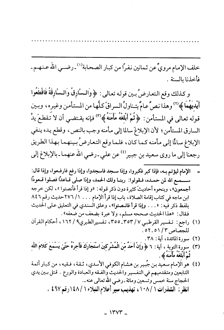 وكذلك وقع التعارض بين قوله تعالى: {وَالسَّارِقُ وَالسَّارِقَةُ فَاقْطَعُوا أَيْدِيَهُمَا} وهذا نص عام يتناول السراق كلها من المستأمن وغيره، وبين قوله تعالى في المستأمن: {ثُمَّ أَبْلِغْهُ مَامَنَهُ} فإنه يقتضي أن لا تقطع يد السارق المستأمن؛ لأن الإبلاغ سالمًا إلى مأمنه وجب بالنص، وقطع يده ينفي الإبلاغ سالمًا إلى مأمنه كما كان، فلما وقع التعارض بينهما بهذا الطريق رجعنا إلى ما روى سعيد بن جبير عن علي- رضي الله عنهما- بالإبلاغ إلى
