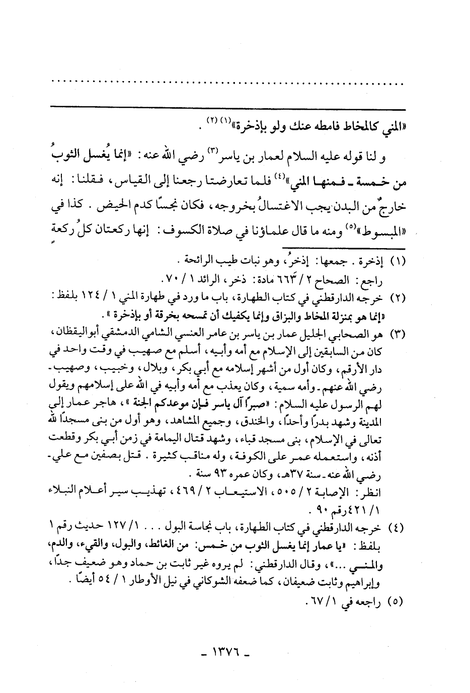 ولنا قوله عليه السلام لعمار بن ياسر رضي الله عنه: ((إنما يغسل الثوب من خمسة- فمنها المني)) فلما تعارضتا رجعنا إلى القياس، فقلنا: إنه خارج من البدن الاغتسال بخروجه، فكان نجسًا كدم الحيض. كذا في ((المبسوط)) ومنه ما قال علماؤنا في صلاة الكسوف: غنها ركعتان كل ركعة