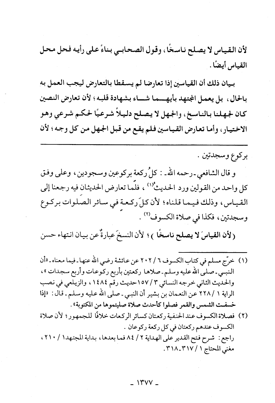 وقال الشافعي- رحمه الله-: كل ركعة بركوعين وسجودين، وعلى وفق كل واحد من القولين ورد الحديث، فلما تعارض الحديثان فيه رجعنا إلى القياس، وذلك فيما قلناه؛ لأن كل ركعة في سائر الصلوات بركوع وسجدتين، فكذا في صلاة الكسوف.