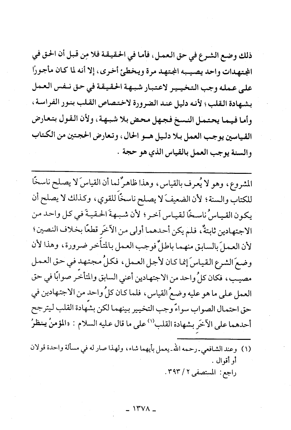 المشروع، وهو لا يعرق بالقياس، وهذا ظاهر لما أن القياس لا يصلح ناسخًا للكتاب والسنة؛ لأن الضعيف لا يصلح ناسخًا للقوي، وكذلك لا يصلح أن يكونا لقياس ناسخًا لقياس آخر؛ لأن شبهة الحقية في كل واحد من الاجتهادين ثابتة، فلم يكن أحدهما أولى من الآخر قطعًا بخلاف النصين؛ لأن العمل بالسابق منهما باطل فوجب العمل بالمتأخر ضرورة، وهذا لأن وضع الشرع القياس إنما كان لأجل العمل، فكل مجتهد في حق العمل مصيب، فكان كل واحد من الاجتهادين أعني السابق والمتأخر صوابًا في حق العمل على ما هو عليه وضع القياس، فلما كان كل واحد من الاجتهادين في حق احتمال الصواب سواء وجب الخيير بينهما لكن بشهادة القلب ليترجح أحدهما على الآخر بشهادة القلب على ما قال عليه السلام: ((المؤمن ينظر