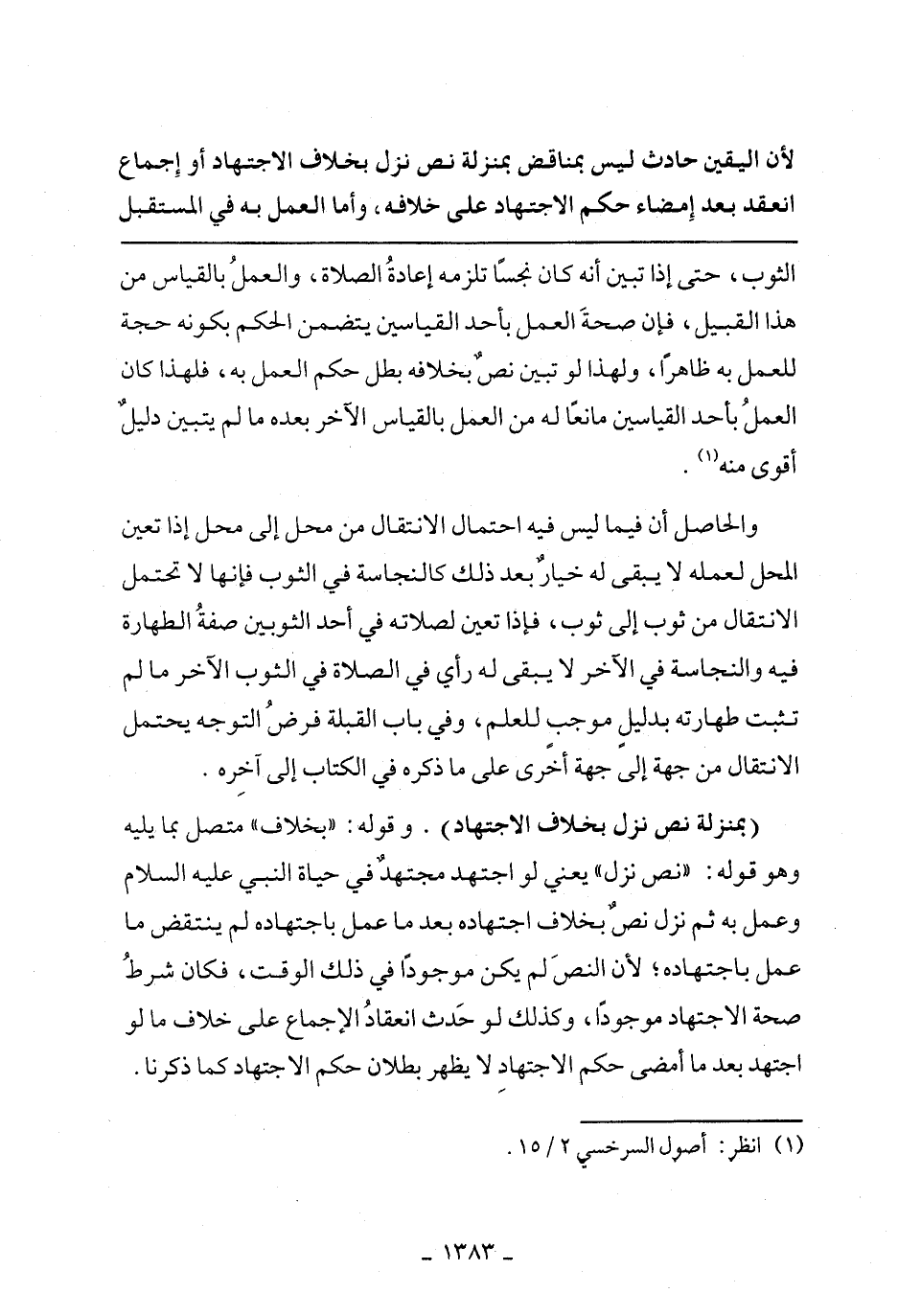 (بمنزلة نص نزل بخلاف الاجتهاد). وقوله: ((بخلاف)) متصل بما يليه وهو قوله: ((نص نزل)) يعني لو اجتهد مجتهد في حياة النبي عليه السلام وعمل به ثم نزل نص بخلاف اجتهاده بعد ما عمل باجتهاده لم ينتقض ما عمل باجتهاده؛ لأن النص لم يكن موجودًا في ذلك الوقت، فكان شرط صحة الاجتهاد موجودًا، وكذلك لو حدث انعقاد الإجماع على خلاف ما لو اجتهد بعد ما أمضى حكم الاجتهاد لا يظهر بطلان حكم الاجتهاد كما ذكرنا.