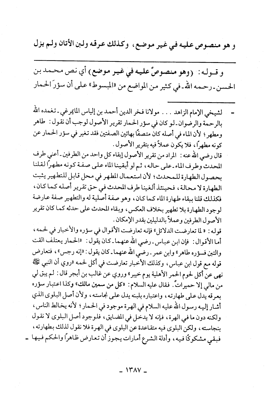 وقوله: (وهو منصوص عليه في غير موضع) أي نص محمد ن الحسن- رحمه الله- في كثير من المواضع من ((المبسوط)) عل أن سؤر الحمار