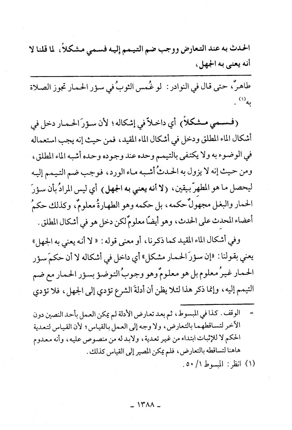 وفي أشكال الماء المقيد كما ذكرنا، أو معنى قوله: ((لا أنه يعني به الجهل)) يعني بقولنا: ((إن سؤر الحمار مشكل)) أي داخل في أشكاله لا أن حكم سؤر الحمار غير معلوم بل هو معلوم وهو وجوب التوضؤ بسؤر الحمار مع ضم التيمم إليه، وإنما ذكر هذا لئلا يظن أن أدلة الشرع تؤدي إلى الجهل، فلا تؤدي