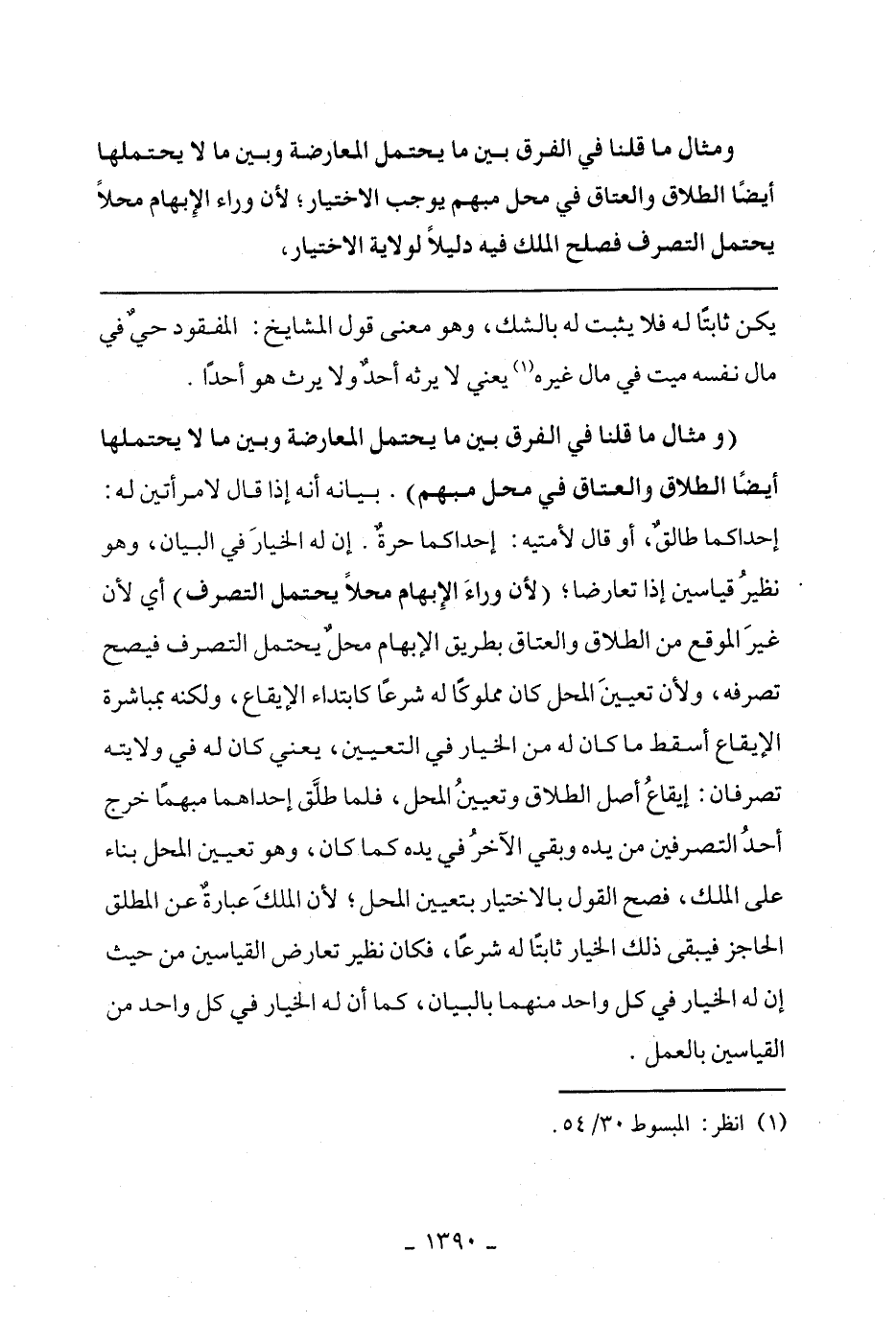 (ومثال ما قلنا في الفرق بين ما يحتمل المعارضة وبيم ما لا يحتملها أيضًا الطلاق والعتاق في محل مبهم). بيانه أنه إذا قال لامرأتين به: إحداكما طالق، أو قال لأمتيه: إحداكما حرة. إن له الخيار في البيان، وهو نظير قياسين إذا تعارضا؛ (لأن وراء الإبهام محلًا يحتمل التصرف) أي لأن غير الموقع من الطلاق والعتاق بطريق الإبهام محل يحتمل التصرف فيصح تصرفه، ولأن تعيين المحل كان مملوكًا له شرعًا كابتداء الإيقاع، ولكنه بمباشرة الإيقاع أسقط ما كان له من الخيار في التعيين، يعني كان له في ولايته تصرفان: إيقاع أصل الطلاق وتعيين المحل، فلما طلق إحداهما مبهمًا خرج أحد التصرفين من يده وبقي الآخر في يده كما كان، وهو تعيين المحل بناء على الملك، فصح القول بالاختيار بتعيين المحل؛ لأن الملك عبارة عن المطلق الحاجز فيبقى ذلك الخيار ثابتًا له شرعًا، فكان نظير تعارض القياسين من حيث إن له الخيار في كل واحد منهما بالبيان، كما أن له الخيار في كل واحد من القياسين بالعمل.