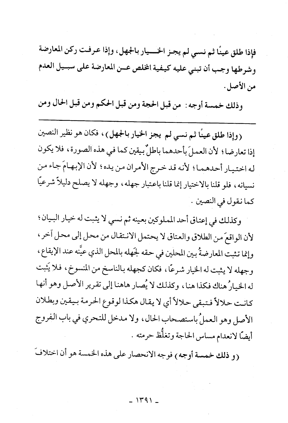 (وإذا طلق عينًا ثم نسي لم يجز الخيار بالجهل)، فكان هو نظير النصين إذا تعارضا؛ لأن العمل بأحدهما باطل بيقين كما في هذه الصورة، فلا يكون له اختيار أحدهما؛ لأنه قد خرج الأمران من يده؛ لأن الإبهام جاء من نسيانه، فلو بالاختيار إنما قلنا باعتبار جهله، وجهله لا يصلح دليلًا شرعيًا كما نقول في النصين.