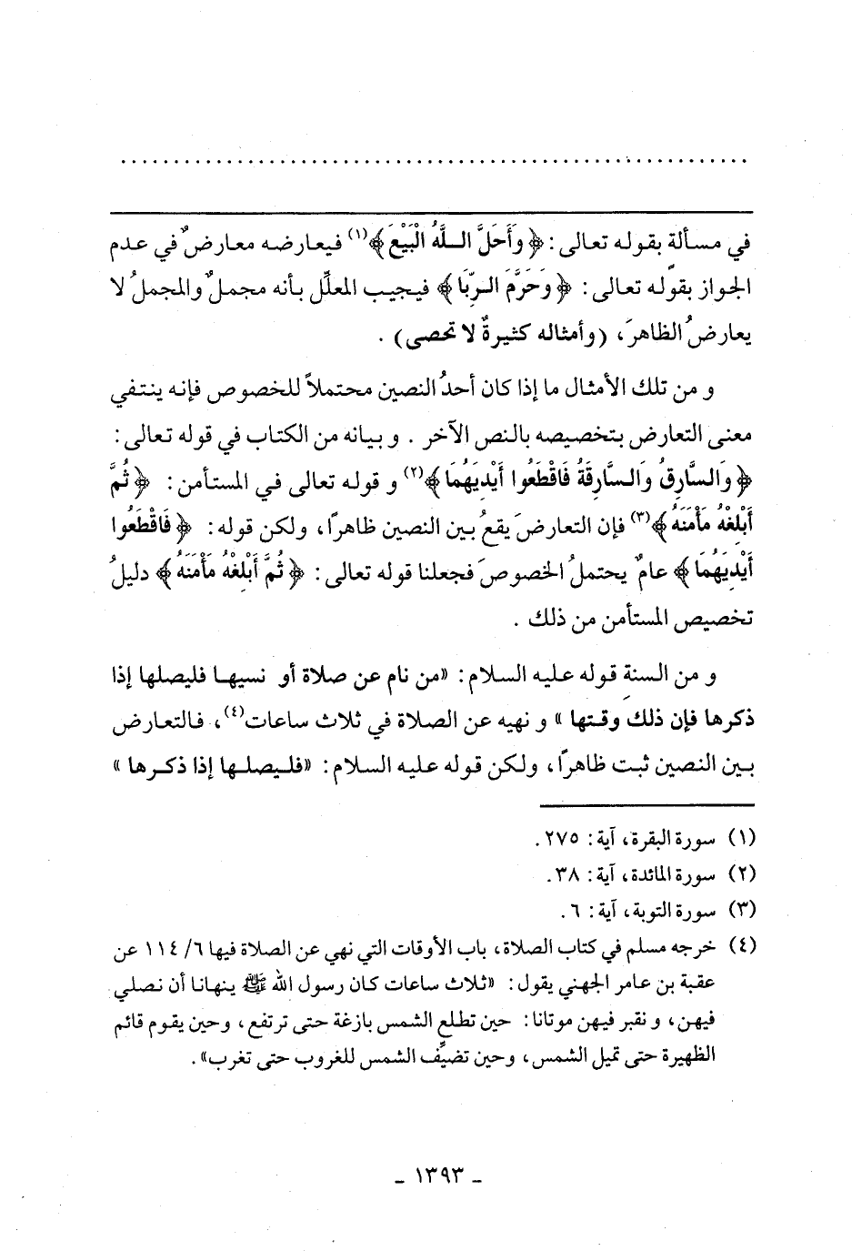 ومن تلك الامثال ما إذا كان أحد النصين محتملًا للخصوص فإنه ينتفي معنى التعارض بتخصيصه بالنص الآخر. وبيانه من الكتاب في قوله تعالى: {وَالسَّارِقُ وَالسَّارِقَةُ فَاقْطَعُوا أَيْدِيَهُمَا} وقوله تعالى في المستأمن: {ثُمَّ أَبْلِغْهُ مَامَنَهُ} فإن التعارض يقع بين النصين ظاهرًا، ولكن قوله: {فَاقْطَعُوا أَيْدِيَهُمَا} عام يحتمل الخصوص فجعلنا قوله تعالى: {ثُمَّ أَبْلِغْهُ مَامَنَهُ} دليل تخصيص المستأمن من ذلك.