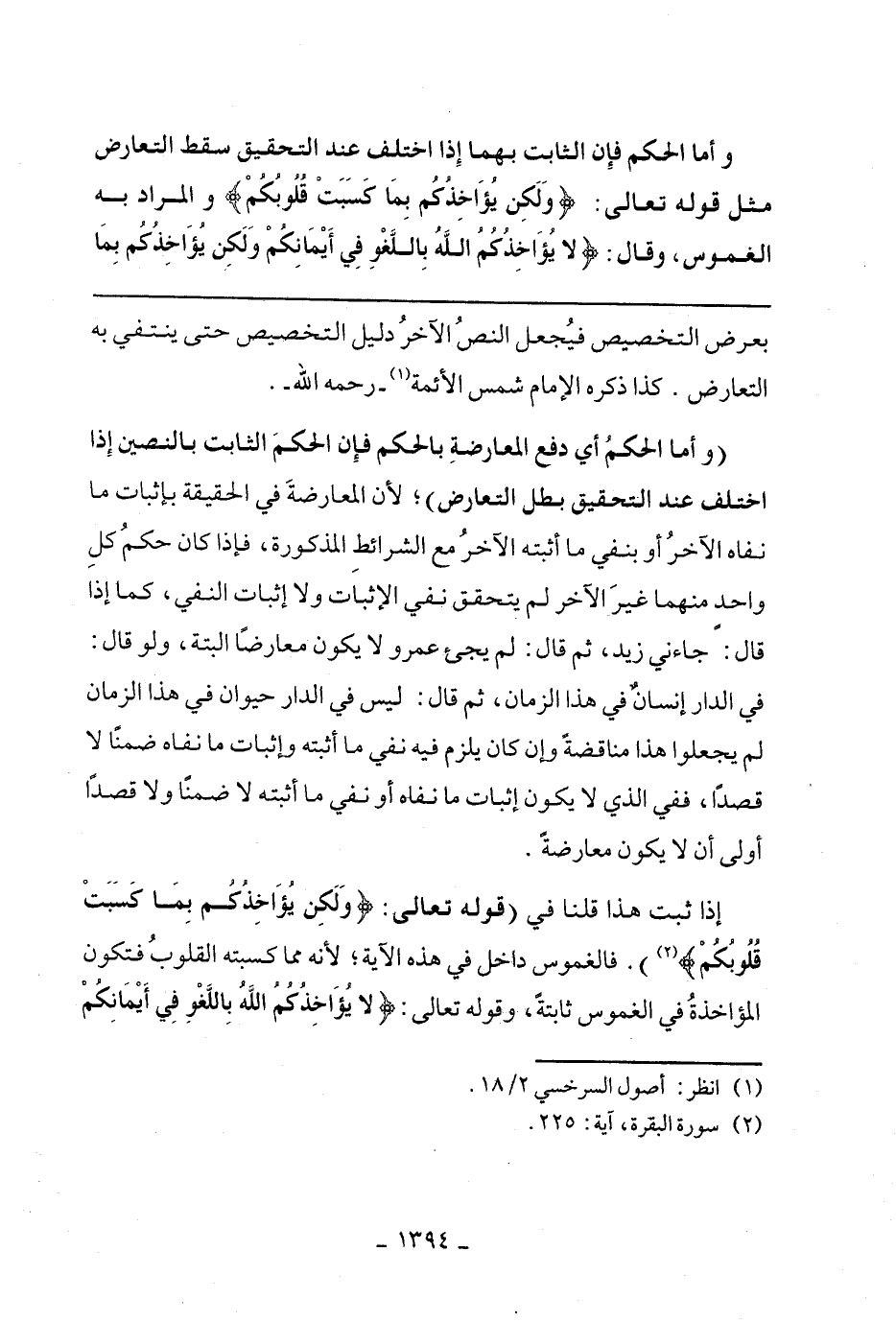 بعرض التخصيص فيجعل النص الآخر دليل التخصيص حتى بنتفي به التعارض. كذا ذكره الإمام شمس الأئمة- رحمه الله-.