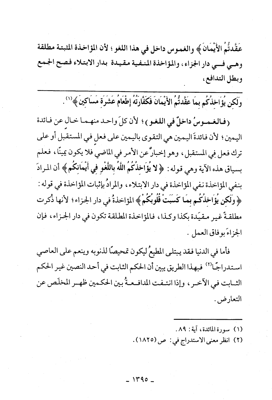 (فالغموس داخل في اللغو)؛ لأن كل واحد منهما خال عن فائدة اليمين؛ لأن فائدة اليمين هي التقوى باليمين على فعل في المستقبل أو على ترك فعل في المستقبل، وهو إخبار عن الأمر في الماضي فلا يكون يمينًا، فعلم بسياق هذه الآية وهي قوله: {لا يُؤَاخِذُكُمُ اللَّهُ بِاللَّغْوِ فِي أَيْمَانِكُمْ} أن المراد بنفي المؤاخذة نفي المؤاخذة في دار الابتلاء، والمراد بإثبات المؤاخذة في قوله: {وَلَكِنْ يُؤَاخِذُكُمْ بِمَا كَسَبَتْ قُلُوبُكُمْ} المؤاخذة في دار الجزاء؛ لأنها ذكرت مطلقة غير مقيدة بكذا وكذا، فالمؤاخذة المطلقة تكون في دار الجزاء، فإن الجزاء بوفاق العمل.