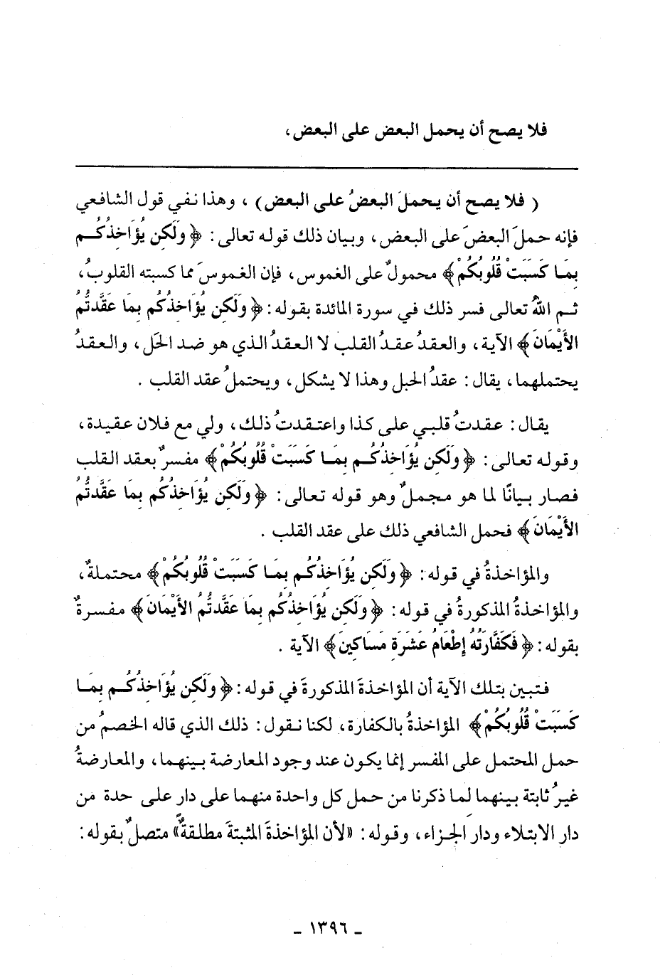 (فلا يصح أن يحمل البعض على البعض)، وهذا نفي قول الشافعي فإنه حمل البعض على البعض، وبيان ذلك قوله تعالى: {وَلَكِنْ يُؤَاخِذُكُمْ بِمَا كَسَبَتْ قُلُوبُكُمْ} محمول على الغموس، فإن الغموس مما كسبته القلوب، ثم الله تعالى فسر ذلك في سورة المائدة بقوله: {وَلَكِنْ يُؤَاخِذُكُمْ بِمَا عَقَّدْتُمُ الأَيْمَانَ} الآية، والعقد عقد القلب لا العقد الذي هو ذد الحل، والعقد يحتملهما، يقال: عقد الحبل وهذا لا يشكل، ويحتمل عقد القلب.
