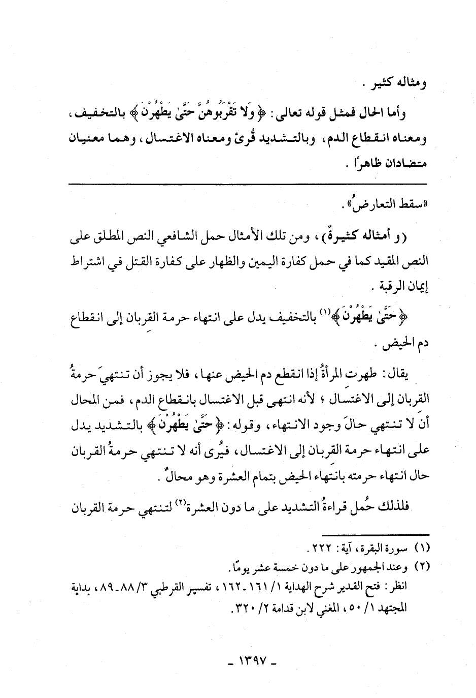 يقال: طهرت المرأة إذا انقطع دم الحيض عنها، فلا يجوز أن تنتهي حرمة القربان إلى الاغتسال؛ لأنه انتهى قبل الاغتسال بانقطاع الدم، فمن المحال أن لا تنتهي حال وجود الانتهاء، وقوله: {حَتَّى يَطْهُرْنَ} بالتشديد يدل على انتهاء حرمة القربان إلى الاغتسال، فيرى أنه لا تنتهي حرمة القربان حال انتهاء حرمته بانتهاء الحيض بتمام العشرة وهو محال.