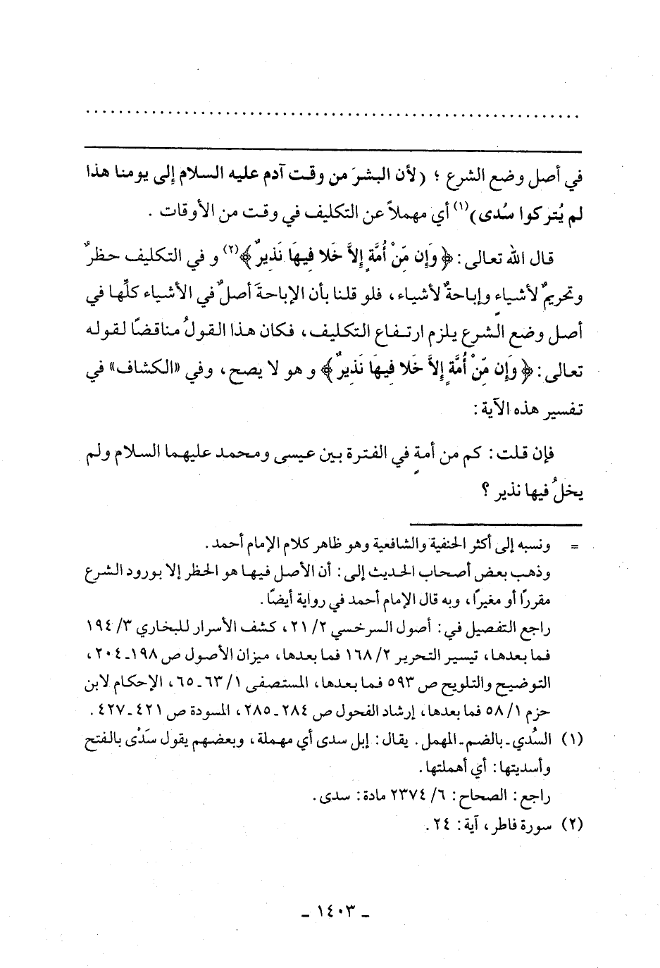 قالي تعالى: {وَإِنْ مِنْ أُمَّةٍ إِلَّا خلا فِيهَا نَذِيرٌ} وفي التكليف حظر وتحريم لأشياء واباحة لأشياء فلو قلنا بأن الإباحة أصل في الأشياء في أصل وضع الشرع يلزم ارتفاع التكليف، فكان هذا القول مناقضا لقوله تعالى: {وَإِنْ مِنْ أُمَّةٍ إِلَّا خلا فِيهَا نَذِيرٌ} وهو لا يصح، وفي " الكشاف "في تفسير هذه الآية: