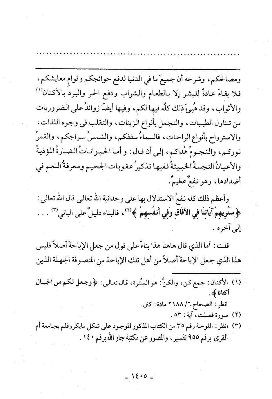ومصالحكم، وشرحه أن جميع ما في الدنيا لدفع حوائجكم وقوام معايشكم، فلا بقاء عادة للبشر إلا بالطعام والشراب ودفع الحر والبرد بالأكنان والأثواب، وقد هييء ذلك كله فيها لكم، وفيها أيضا زوائد عن الضروريات من تناول الطيبات، والتجمل بأنواع الزينات، والتقلب في وجوه اللذات، والاسترواح بأنواع الراحات، فالسماء سقفكم، والشمس سراجكم، والقمر نوركم، والنجوم هداكم، إلي ان قال: وما الحيوانات الضارة المؤذية والأعيان النجسة الخبيثة ففيها تذكير عقوبات الجحيم ومعرفة النعم في أضدادها، وهو نفع عظيم.