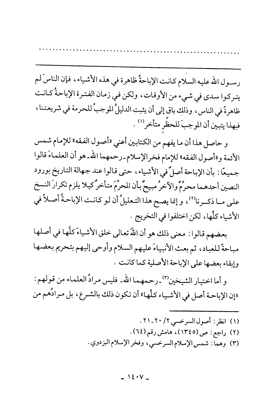 وحاصل هذا أن ما يفهم من الكتابين أعني " أصول الفقه " للإمام شمس الأئمة و " أصول الفقه " للإمام فخر الإسلام - رحمهما الله - هو أن العلماء قالوا جميعا: بأن الإباحة أصل في الأشياء، حتي قالوا عند جهالة التاريخ بورود النصين أحدهما محرم والآخر مبيح بان المحرم متأخرا كيلا يلزم تكرار النسخ علي ما ذكرنا، وإنما يصح التعليل أن لو كانت الإباحة أصلا في الأشياء كلها، لكن إختلفوا في التخريج.