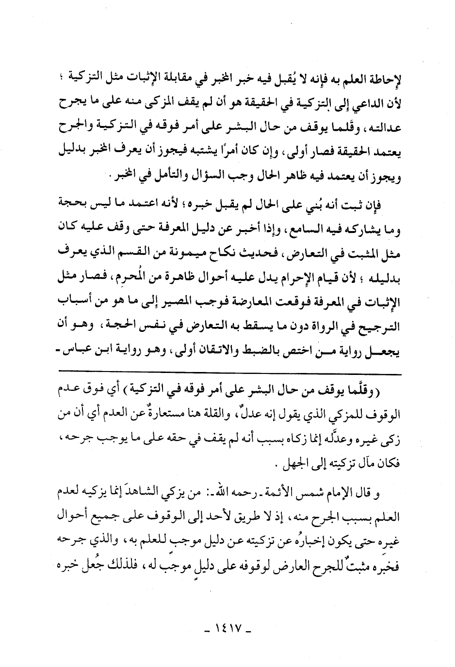 (وقلما يوقف من حال البشر علي أمر فوقه في التزكية) أي فوق عدم الوقوف للمزكي الذي يقول انه عدل، والقلة هنا مستعارة عن العدم أي أن من زكي غيره وعدله إنما زكاه بسبب أنه لم يقف في حقه علي ما يوجب جرحه فكان مآل تزكيته إلي الجهل.