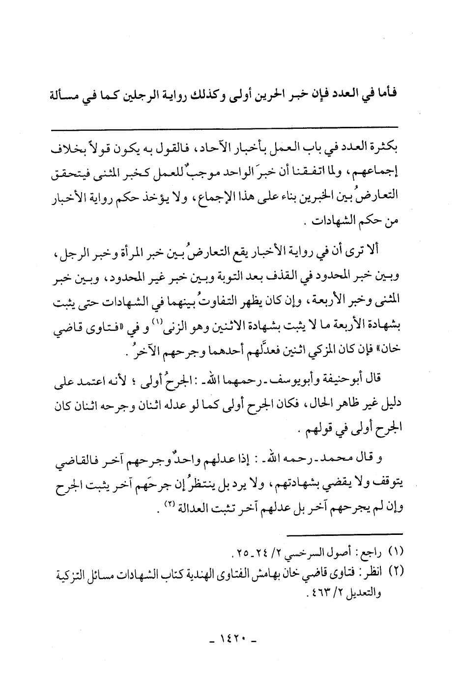 ألا تري أن في رواية الأخبار يقع التعارض بين خبر المرأة وخبر الرجل، وخبر المحدود في القذف بعد التوبة وبين خبر غير المحدود، وبين خبر المثني وخبر الأربعة ما لا يثبت بشهادة الاثنين وهو الزني (1). وفي " فتاوي قاضي خان " فإن كان المزكي إثنين فعدلهم أحدهما وجرحهم الأخر.