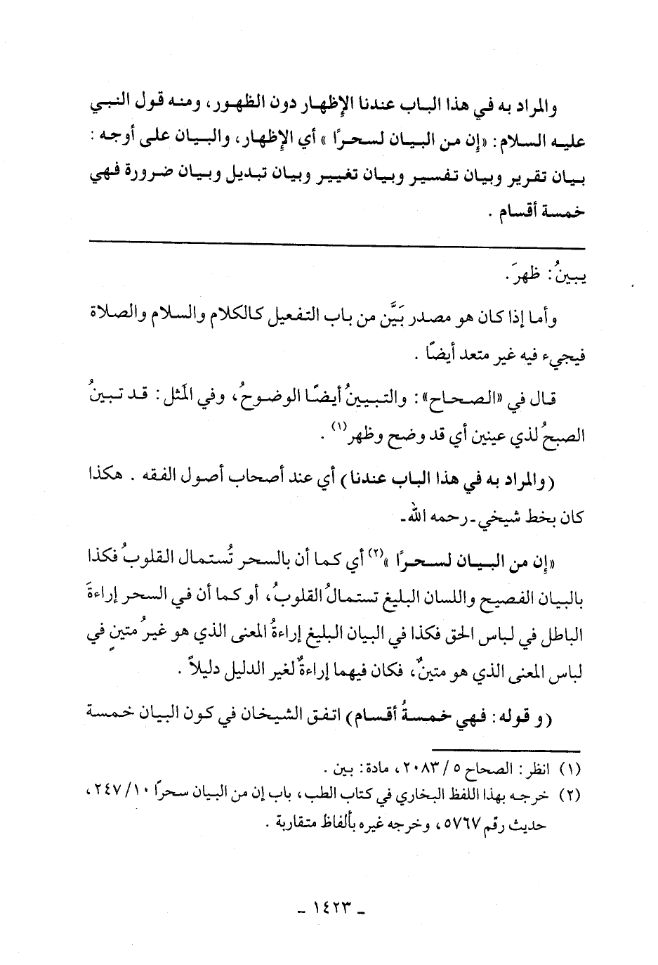 " غن من البيان لسحرا" أي كما ان بالسحر تستمال القلوب فكذا بالبيان الفصيح واللسان البليغ تستمال القلوب، أو كما أن للسحر إراءة الباطل في لباس الحق فكذا في البيان البليغ إراءة المعني الذي هو غير متين، فكان فيهما إراءة لغير الدليل دليلا.