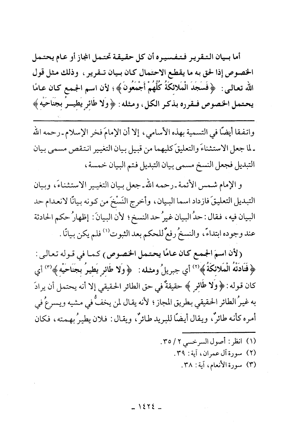 طَائِرٍ يَطِيرُ بِجَنَاحَيْهِ} أي كان قوله {وَلا طَائِرٍ} حقيقة في حق الطائر الحقيقي إلا انه يحتمل أن يراد به غير الطائر الحقيقي بطريق المجاز؛ لانه يقال لمن يخف في مشيه ويسرع في أمره كأنه طائر، ويقال: فلان يطير بهمته، فكان