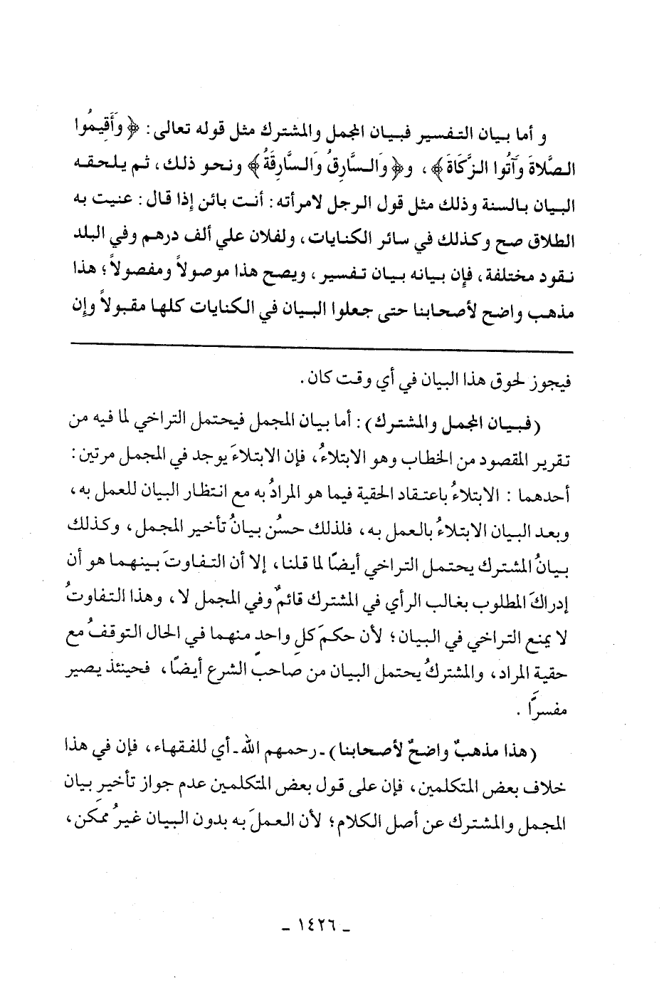 (وهذا مذهب واضح لأصحابنا) - رحمهم الله- أي للفقهاء، فإن في هذا خلاف بعض المتكلمين، فان علي قول بعض المتكلمين عدم جواز تأخير بيان المجمل والمشترك عن أصل الكلام، لأن العمل بدون البيان غير ممكن،