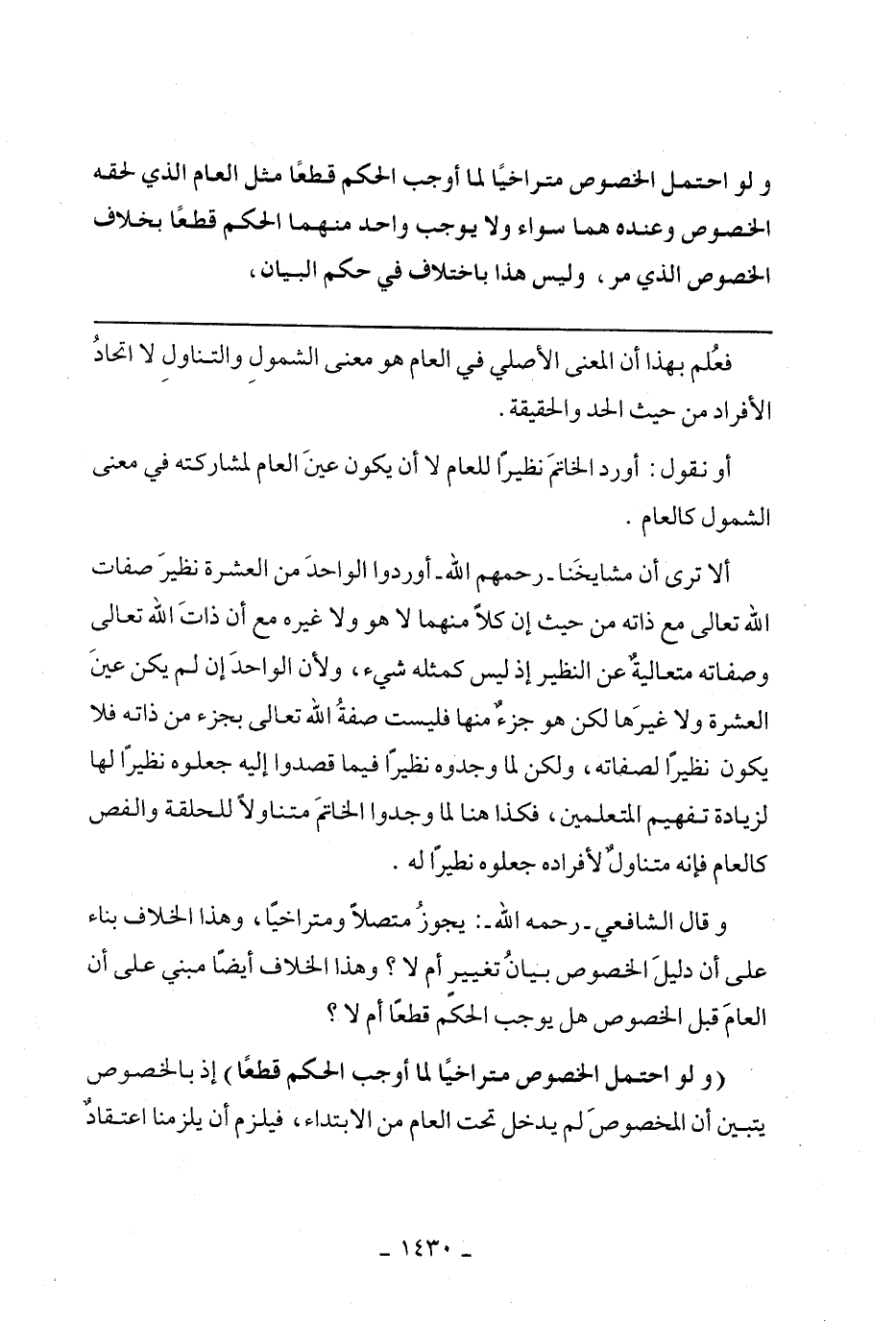وقال الشافعي - رحمه الله-: يجوز متصلا ومتراخيا، وهذا الخلاف بناء علي دليل الخصوص بيان تغيير أم لا؟ وهذا الخلاف أيضا مبني علي أن العام قبل الخصوص هل يوجب الحكم قطعا أم لا؟