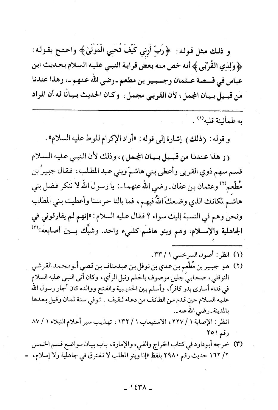 (وهذا عندنا من قبيل بيان المجمل) ـ، وذلك لان النبي عليه السلام قسم سهم ذوي القربيواعطي بني هاشم وبني عبد المطلب، فقال جبير بن مطعم وعثمان بن عفان - رضي الله عنهما - يا رسول الله لا ننكر فضل بني هاشم لمكانك الذي وضعك الله فيهم، فما بالنا حرمتنا وأعطيت بني عبد المطلب ونحن وهم في النسبة إليك سواء؟ فقال عليه السلام: " إنهم لم يفارقوني في الجاهلية والإسلام وهم بني هاشم كشيء واحد. وشبك بين أصابعه"