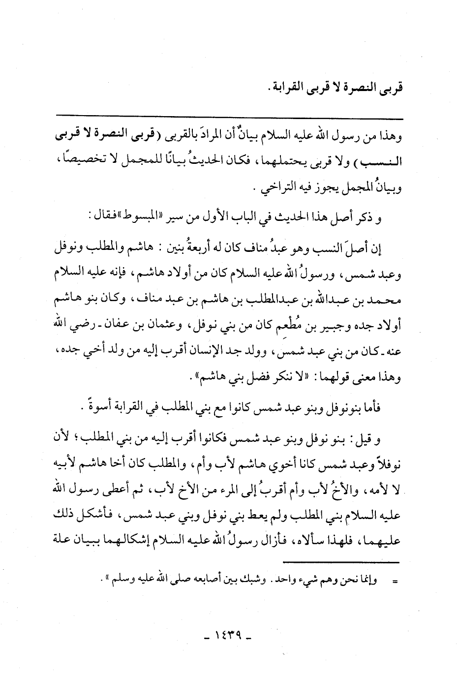إن أصل النسب وهو عبد مناف كان له أربعة بنين: هاشم والمطلب ونوفل وعبد شمس، ورسول الله عليه السلام كان من أولاد هاشم بن عبد مناف، وكان بنو هاشم أولاد جده وجبير بن مطعم كان من بني نوفل، وعثمان بن عفان - رضي الله عنه- كان من بني عبد شمس، وولد جد الإنسان أقرب إليه من ولد أخي جده، وهذا معني قولهما:"لا ننكر فضل بني هاشم".