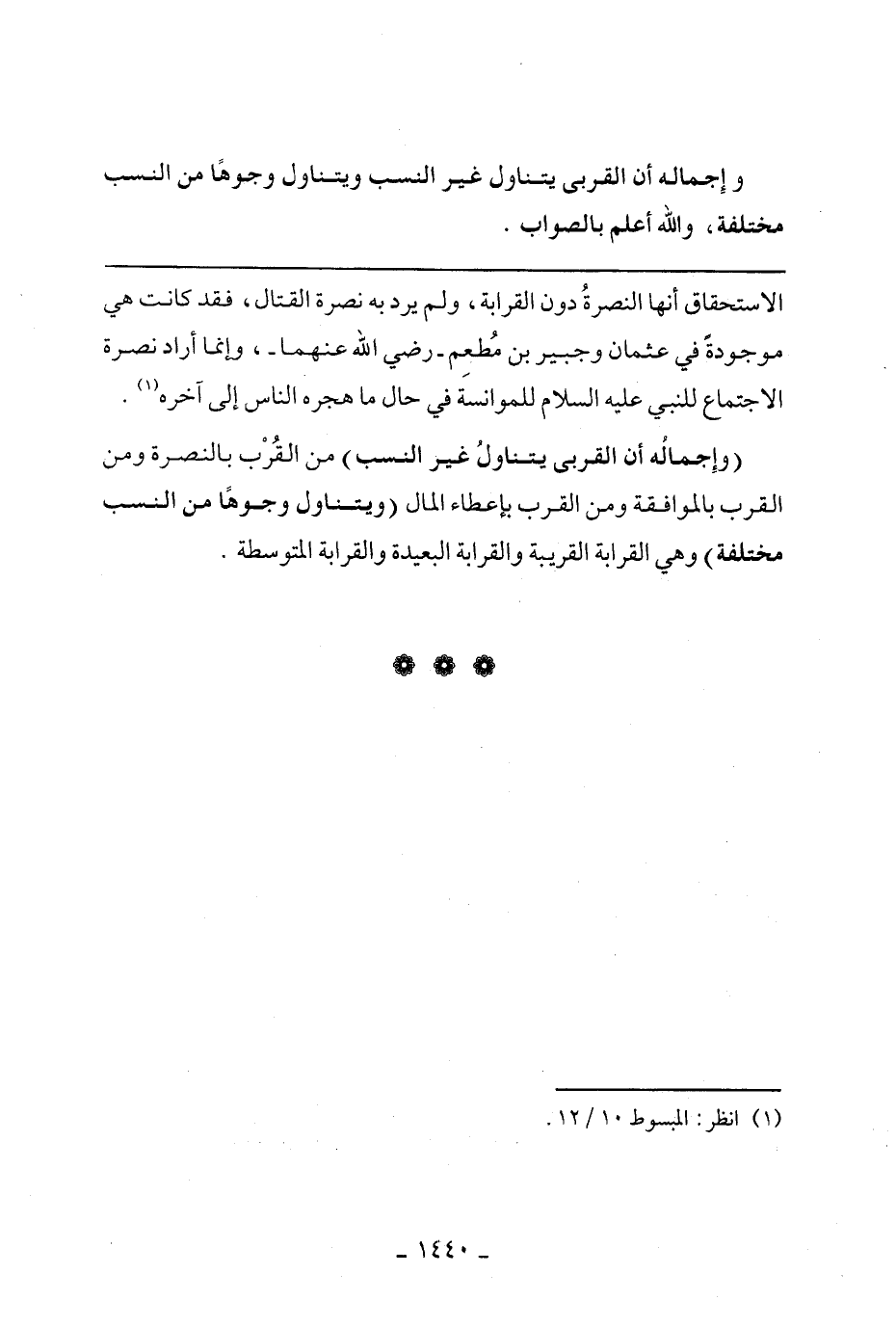 الاستحقاق أنها النصرة لا القرابة، ولم يرد به نصرة القتال، فقد كانت هي موجودة في عثمان وجبير بن مطعم - رضي الله عنهما- وإنما أراد نصرة الإجتماع للنبي عليه السلام للمؤانسة في حال ما هجره الناس إلي آخره.