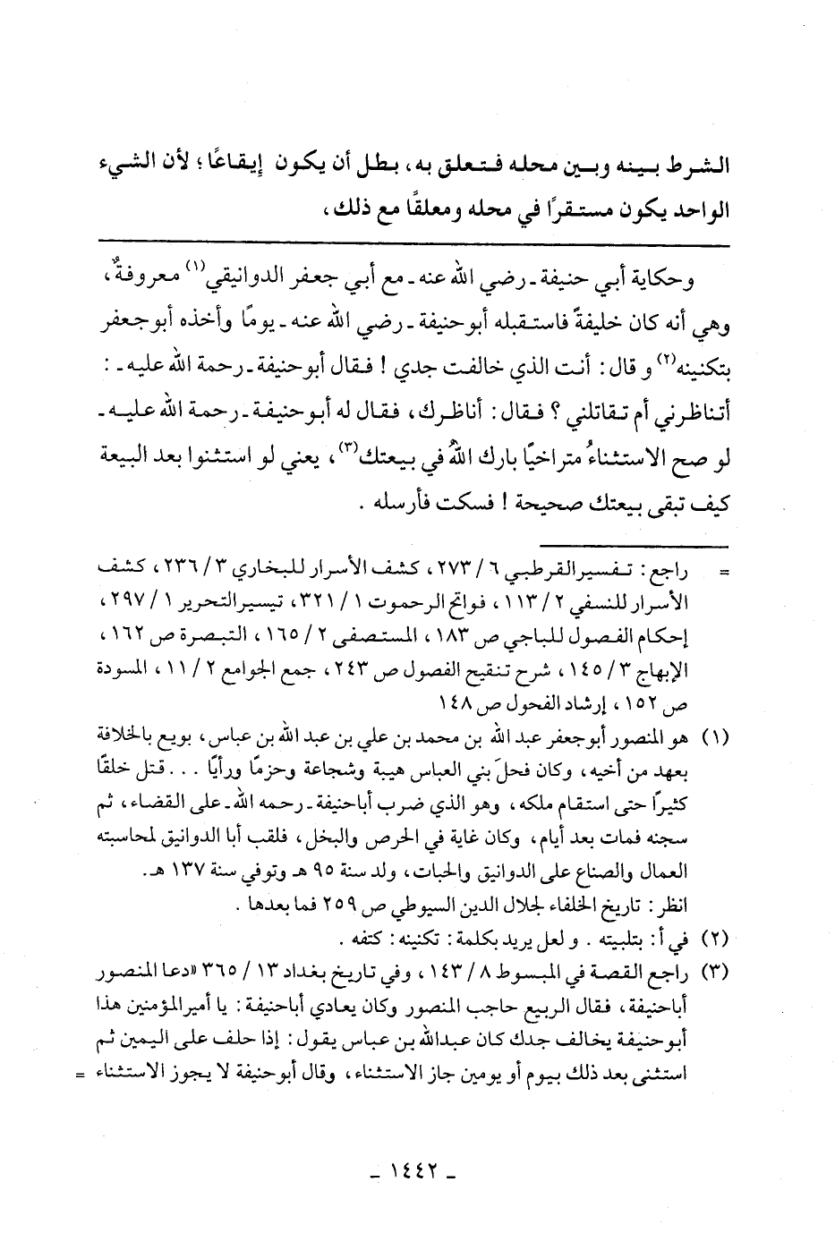 وحكاية أبي حنيفة - رضي الله عنه- مع أبي جعفر الدوانيقي معروفة، وهي أنه كان خليفة فاستقبله أبو حنيفة - رضي الله عنه- يوما وأخذه أبو جعفر بتكنيته وقال: أنت الذي خالفت جدي! فقال أبو حنيفه - رحمة الله عليه -: أتناظرني أم تقاتلني؟ فقال أناظرك، فقال له أبو حنيفه - رحمة الله عليه -لو صح الاستثناء متراخيا بارك الله في بيعتك، يعني لو استثنوا بعد البيعة كيف تبقي بيعتك صحيحة! فسكت فأرسله.