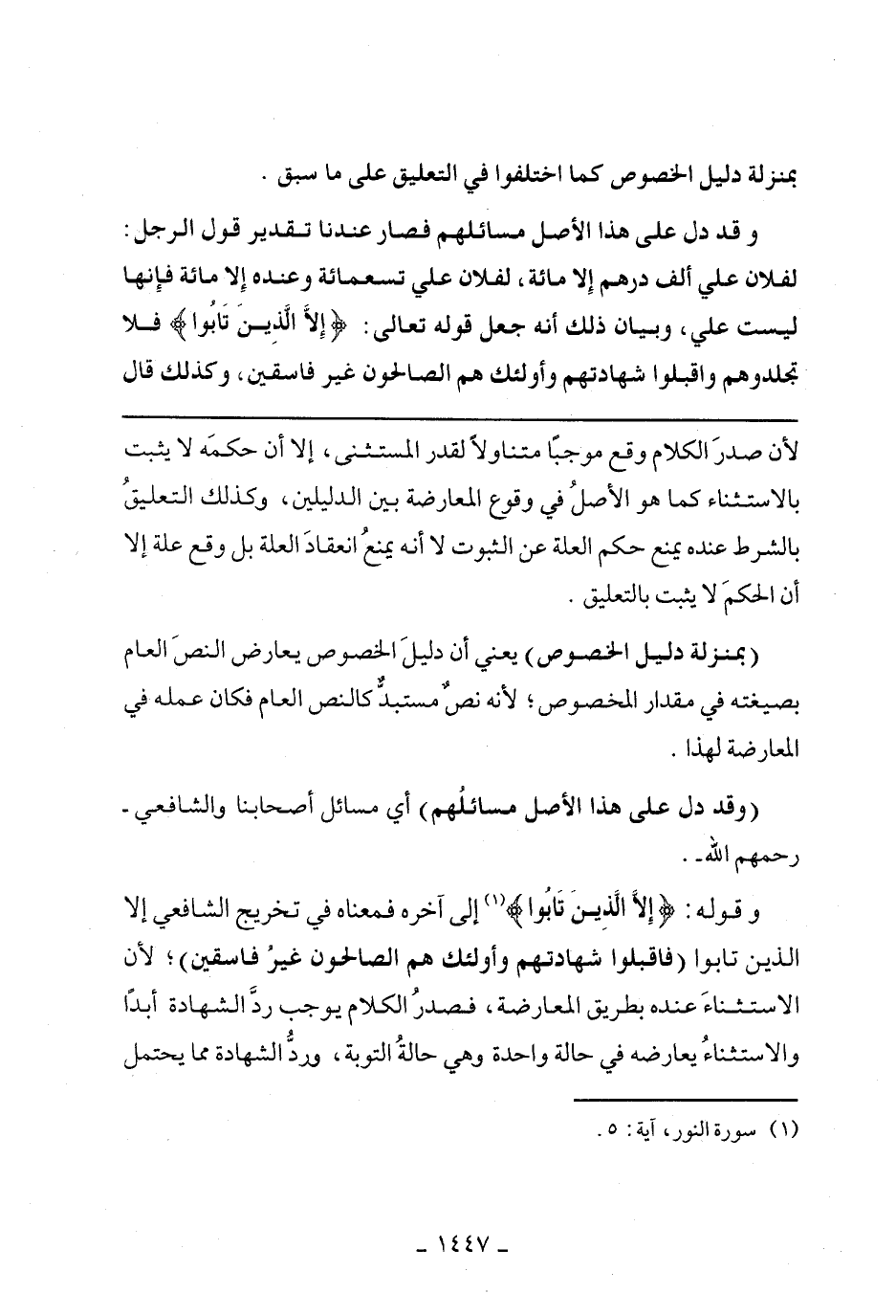 وقوله: {إِلَّا الَّذِينَ تَابُوا} إلي آخرهفمعناه في تخريج الشافعي إلا الذين تابوا (فاقبلوا شهادتهم وأولئك هم الصالحون غير فاسقين)؛ لأن الاستثناء عنده بطريق المعارضة، فصدر الكلام يوجب رد الشهادة أبدا والاستثناء يعارضه في حالة واحدة وهي حالة التوبة، ورد الشهادة مما يحتمل