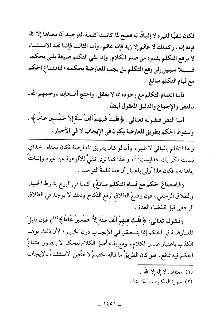 (فقوله تعالى: (فَلَبِثَ فِيهِمْ أَلْفَ سَنَةٍ إِلاَّ خَمْسِينَ عَامًا)) فإن دليل المعارضة في الحكم إنما يتحقق في الإيجاب دون الخبر؛ لأن ذلك يوهم الكذب باعتبار صدر الكلام، ومع بقاء أصل الكلام للحكم لا يتصور امتناع الحكم فيه بمانع، فلو كان الطريق ماقاله الخصم لاختص الاستثناء بالإيجاب