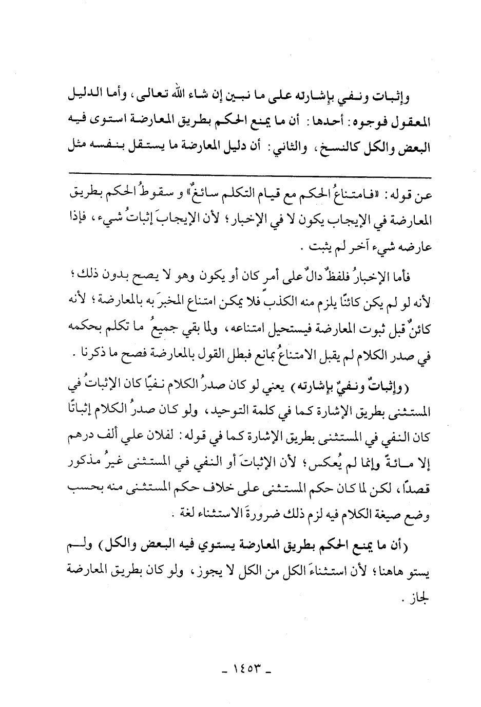 عن قوله: «فامتناع الحكم مع قيام التكلم سائغ» وسقوط الحكم بطريق المعارضة في الإيجاب يكون لا في الإخبار؛ لأن الإيجاب إثباب شيء، فإذا عارضه شيء آخر لم يثبت.