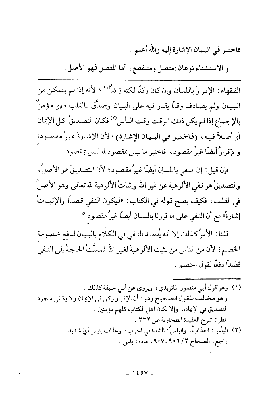 فإن قيل: إن النفي باللسان أيضًا غير مقصود؛ لأن التصديق هو الأصل، والتصديق هو نفي الألوهية عن غير الله وإثبات الألوهية لله تعالى وهو الأصل في القلب، فكيف يصح قوله في الكتاب: «ليكون النفي قصدًا والإثبات إشارة» مع أن النفي على ماقررنا باللسان أيضًا غير مقصود؟