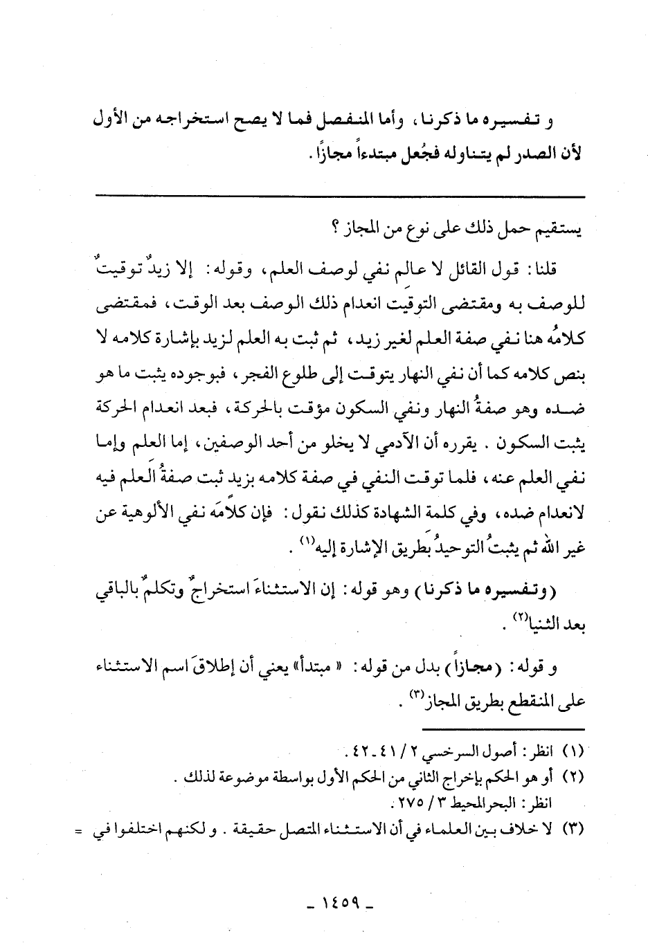 قلنا: قول القائل لا عالم نفي لوصف العلم، وقوله: إلا زيد توقيت للوصف به ومقتضى التوقيت انعدام ذلك الوصف بعد الوقت، فمقتضى كلامه هنا نفي صفة العلم لغير زيد، ثم ثبت به العلم لزيد بإشارة كلامه لا بنص كلامه كما أن نفي النهار يتوقت إلى طلوع الفجر، فبوجوده يثبت ما هو ضده وهو صفة النهار ونفي السكون مؤقت بالحركة، فبعد انعدام الحركة يثبت السكون. يقرره أن الآدمي لا يخلو من أحد الوصفين، إما العلم وإما نفي العلم عنه، فلما توقت النفي فى صفة كلامه بزيد ثبت صفة العلم فيه لانعدام ضده، وفي كلمة الشهادة كذلك نقول: فإن كلامه نفي الألوهية عن غير الله ثم يثبت التوحيد بطريق الإشارة إليه.