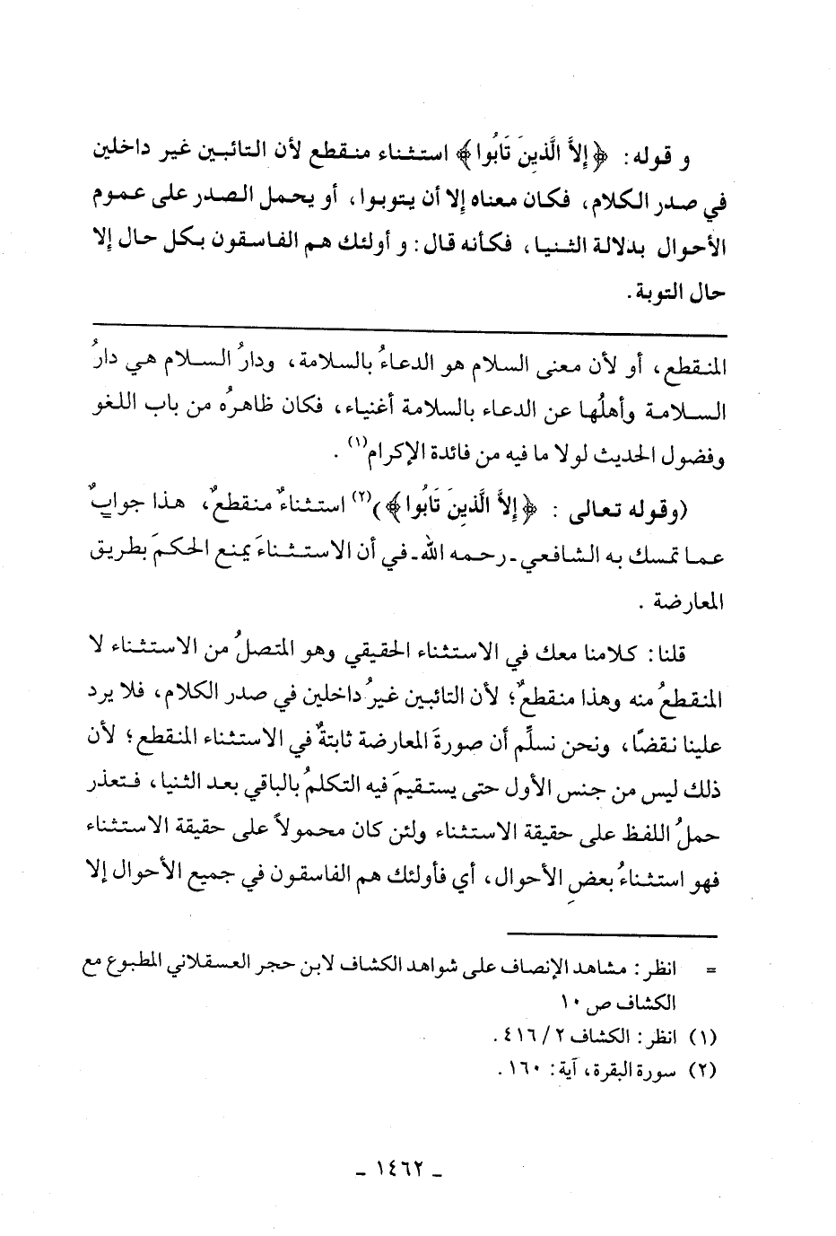 قلنا: كلامنا معك في الاستثناء الحقيقي وهو المتصل من الاستثناء لا المنقطع منه وهذا منقطع؛ لأن التائبين غير داخلين في صدر الكلام، فلا يرد علينا نقضًا، ونحن نسلم أن صورة المعارضة ثابتة في الاستثناء المنقطع؛ لأن ذلك ليس من جنس الأول حتى يستقيم فيه التكلم بالباقي بعد الثنيا، فتعذر حمل اللفظ على حقيقة الاستثناء ولئن كان محمولًا على حقيقة الاستثناء فهو استثناء بعض الأحوال، أي فأولئك هم الفاسقون في جميع الأحوال إلا