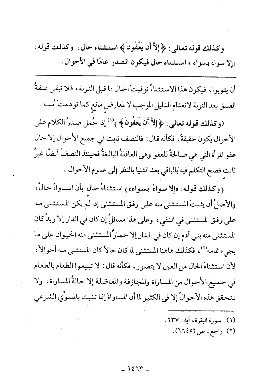 (وكذلك قوله تعالى: (إِلَّا أَنْ يَعْفُونَ) إذا حمل صدر الكلام على الأحوال يكون حقيقة، فكأنه قال: فالنصف ثابت في جميع الأحوال إلا حال عفو المرأة التي هي صالحة للعفو وهي العاقلة البالغة فحينئذ النصف أيضًا غير ثابت فصح التكلم فيه بالباقي بعد الثنيا بالنظر إلى عموم الأحوال.