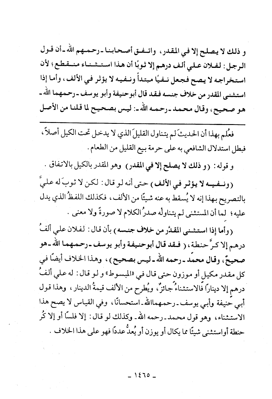 (وأما إذا استثنى المقدر من خلاف جنسه) بأن قال: لفلان على ألف درهم إلا كر حنطة، (فقد قال أبو حنيفة وأبو يوسف -رحمهما الله- هو صحيح، وقال محمد -رحمه الله- ليس بصحيح)، وهذا الخلاف أيضًا في كل مقدر مكيل أو موزون حتى قال في "المبسوط" ولو قال: له علي ألف درهم إلا دينارًا فالاستثناء جائز، ويطرح من الألف قيمة الدينار، وهذا قول أبي حنيفة وأبي يوسف -رحمهما الله- استحسانًا، وفي القياس لا يصح هذا الاستثناء، وهو قول محمد -رحمه الله- وكذلك لو قال: إلا فلسًا أو إلا كر حنطة أو استثنى شيئًا مما يكال أو يوزن أو يعد عددًا فهو على هذا الخلاف.