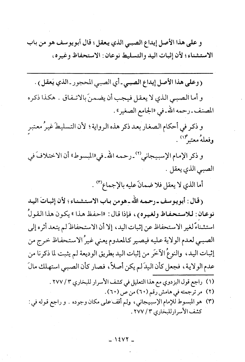 (قال: أبو يوسف -رحمه الله- هو من باب الاستثناء؛ لأن إثبات اليد نوعان: للاستحفاظ ولغيره)، فإذا قال: "أحفظ هذا" يكون هذا القول استثناء لغير الاستحفاظ عن إثبات اليد، إلا أن الاستحفاظ لم يتعد أثره إلى الصبي لعدم الولاية عليه فيصير المعدوم يعني غير الاستحفاظ خرج من إثبات اليد، والنوع الآخر من إثبات اليد بطريق الوديعة لم يثبت لما ذكرنا من عدم الولاية، فجعل كأن اليد لم يكن أصلًا، فصار كأن الصبي استهلك مال